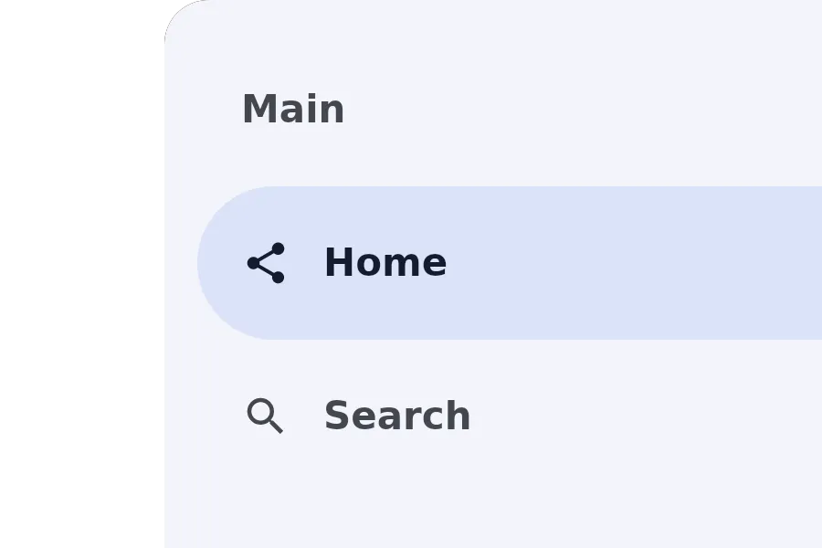 import { NavigationDrawer } from "@material";export component Example inherits Window { width: 400px; height: 300px; background: transparent; navigation_drawer := NavigationDrawer { width: 280px; height: parent.height; groups: [ { title: "Main", items: [ { icon: @image-url("../icons/share.svg"), text: "Home" }, { icon: @image-url("../icons/search.svg"), text: "Search" } ] } ]; }}